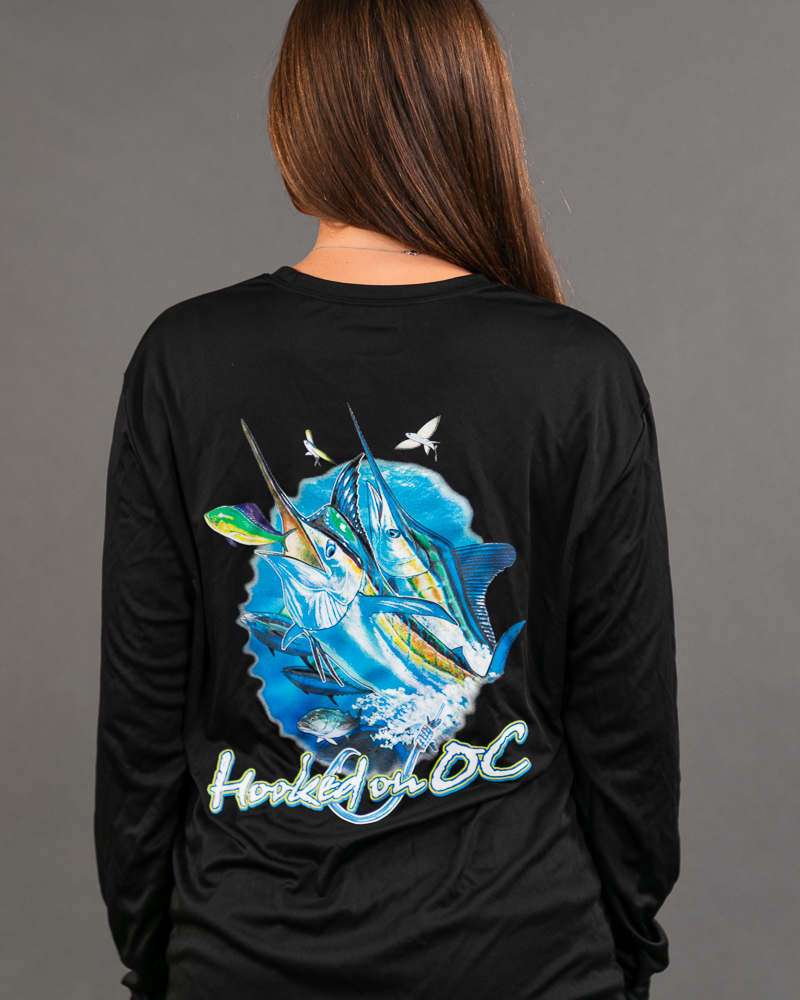 A new design of our comfortable long sleeve tech shirt featuring custom art of marlin and tuna.
