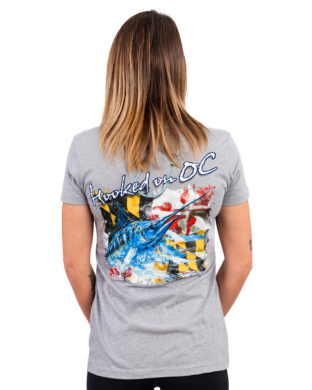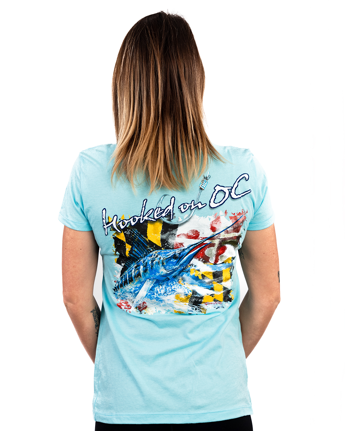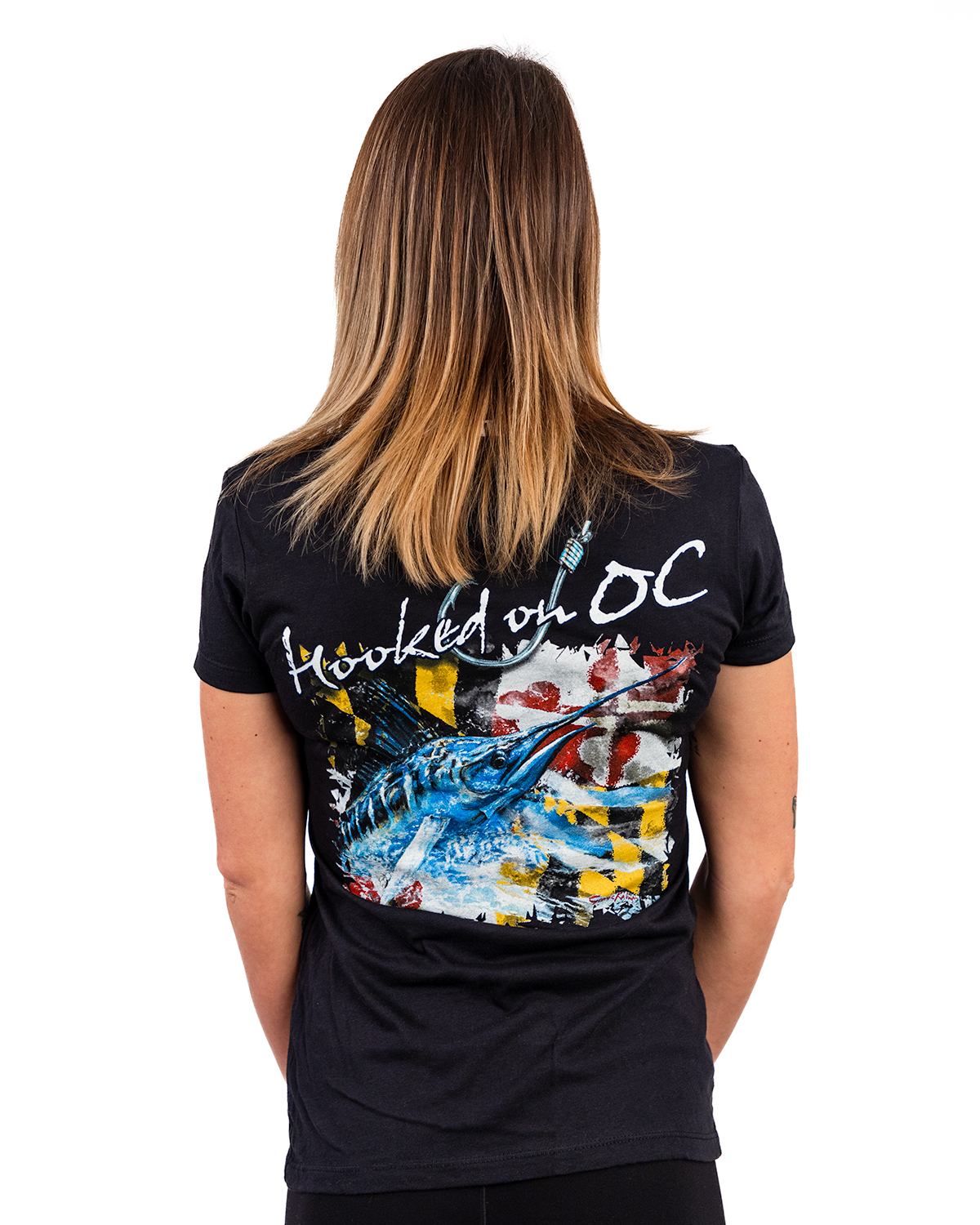A ladies version of our comfortable short sleeve shirt with our custom design based on Maryland’s state flag.