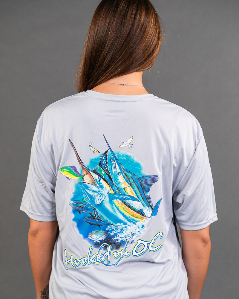 Our high quality short sleeve tech shirt featuring a custom image of marlin and tuna.